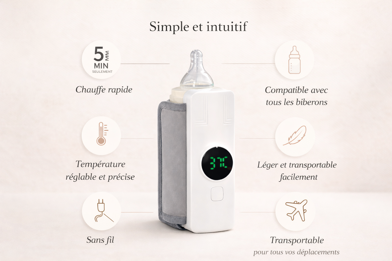 e chauffe-biberon vise une température idéale de37°C, la même que le lait maternel, afin d’éviter tout risque de brûlure et d’assurer un confort optimal pour bébé.